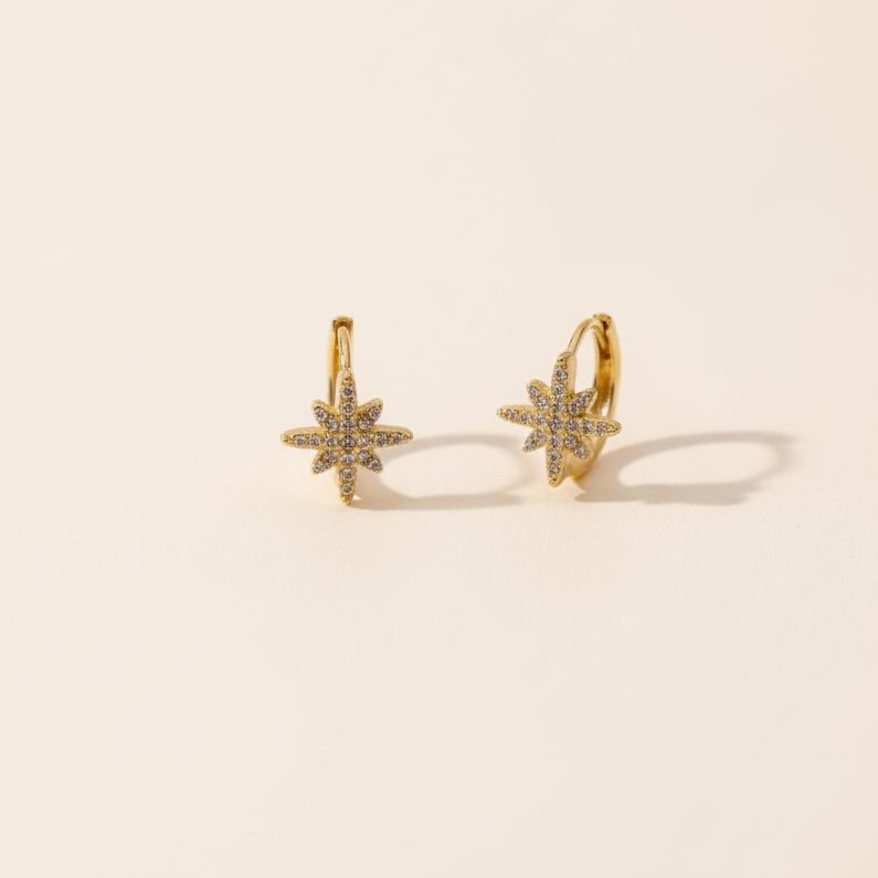Radiance Hoops—a dainty pair of 18K gold-toned mini hoop earrings featuring sparkling star-shaped accents. Each hoop is elegantly fronted by a star design, encrusted with clear cubic zirconia stones that catch the light with every turn.