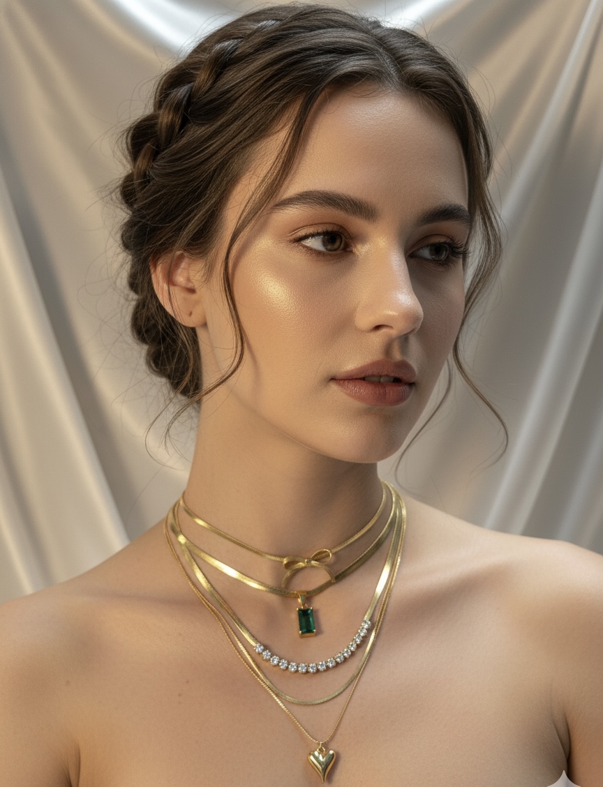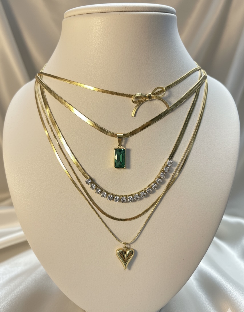 Shine with elegance and charm wearing Vyaraa’s 4 Layer Gold Plated Chain Combo. This stunning layered necklace set features a bow chain, green stone pendant, diamond crystal chain, and heart charm — all crafted from premium anti-tarnish stainless steel. Perfect for both festive and everyday looks.