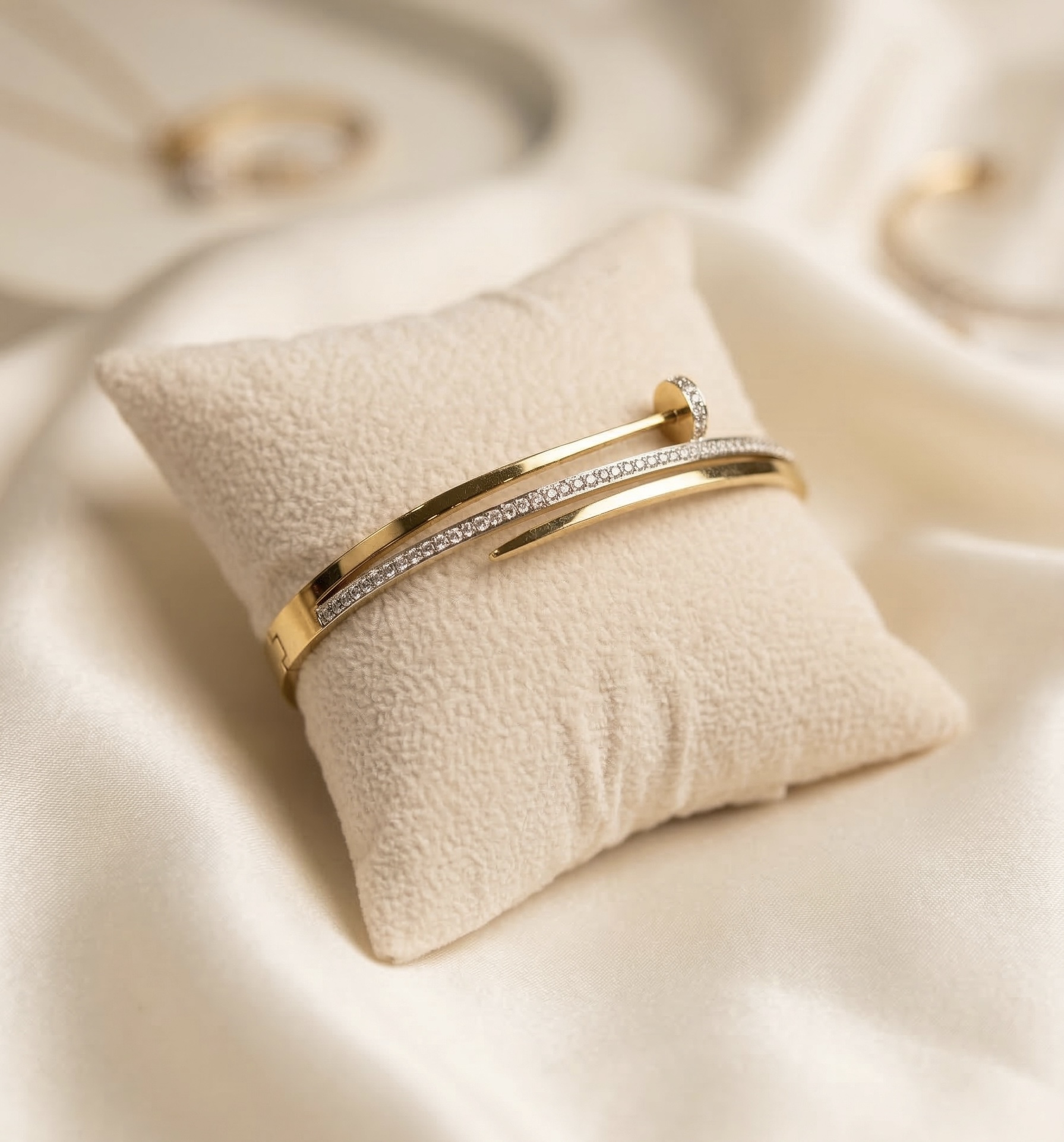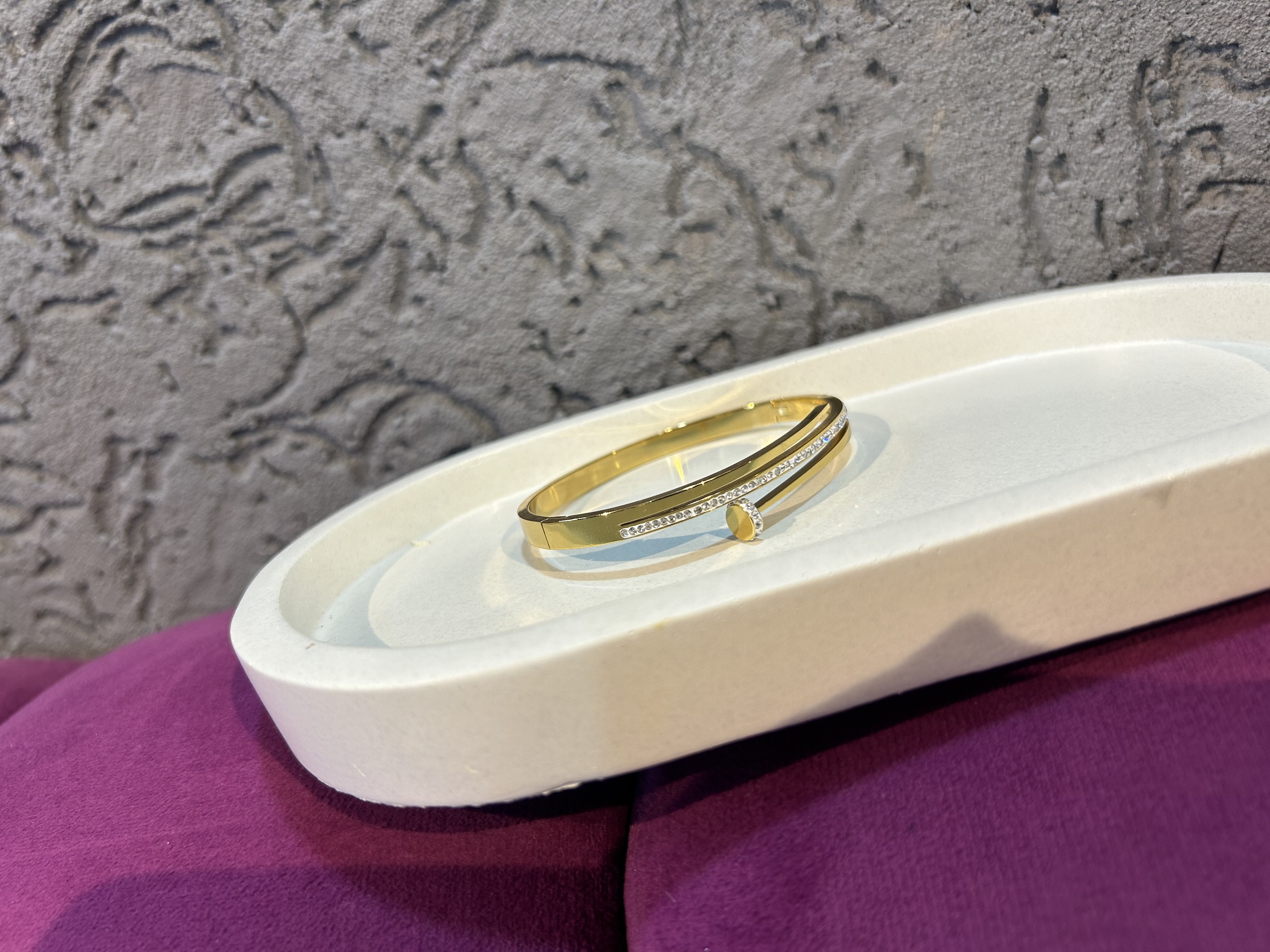 - Step into style with Vyaraa’s Nail Trending Gold Plated Bracelet for Women, inspired by bold elegance and timeless fashion. Made from durable stainless steel and finished with high-quality 18k gold plating, it offers a lasting shine and luxurious look.